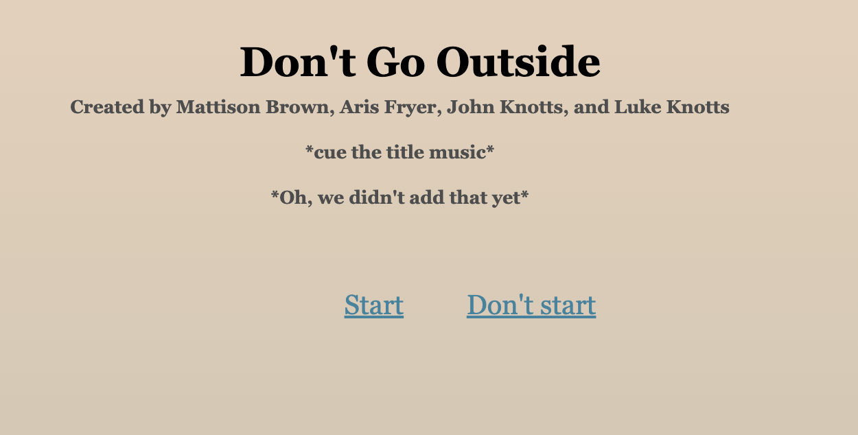 Don't Go Outside is a text based story inspired by Choose Your Own Adventure books. It was worked on by myself, John Knotts, Aris Fryer, Mattison Brown, with some contributions from Nathan Branch and Elkan Lee.