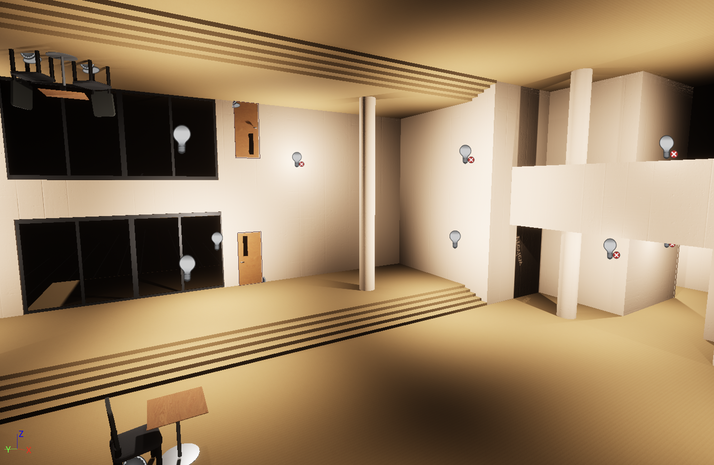 The program makes use of Unreal Engine's geometry script plug-in, and the problem seemed to be that the program was told to run on the event "Event OnRebuildGeneratedMesh", an event that I don't think ever happens. My friend did some rejigging to try to make it work, but alas, no luck yet. For playtesting, I replaced the stairs with a ramp and some text apologizing for the maintence undergoing on the stairs.