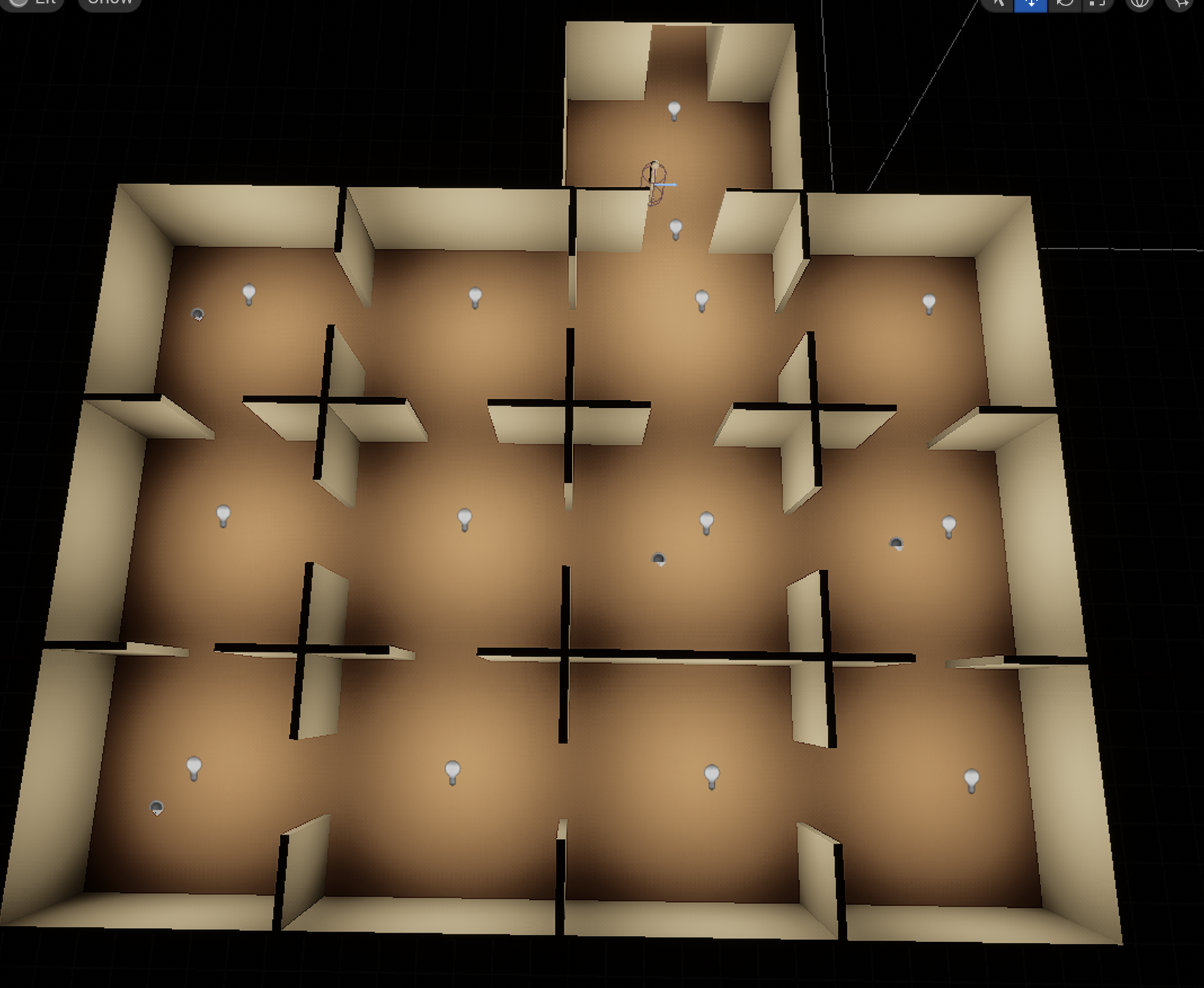 While most of my work this week was focused on planning, I did do a little bit of level design. Inspired by the original image of the Backrooms, I set out to experiment with more Backrooms-esq room design. For those of you who don't know, the Backrooms is an internet mythos and urban legend consisting of infinately winding hallways, and other strange places.