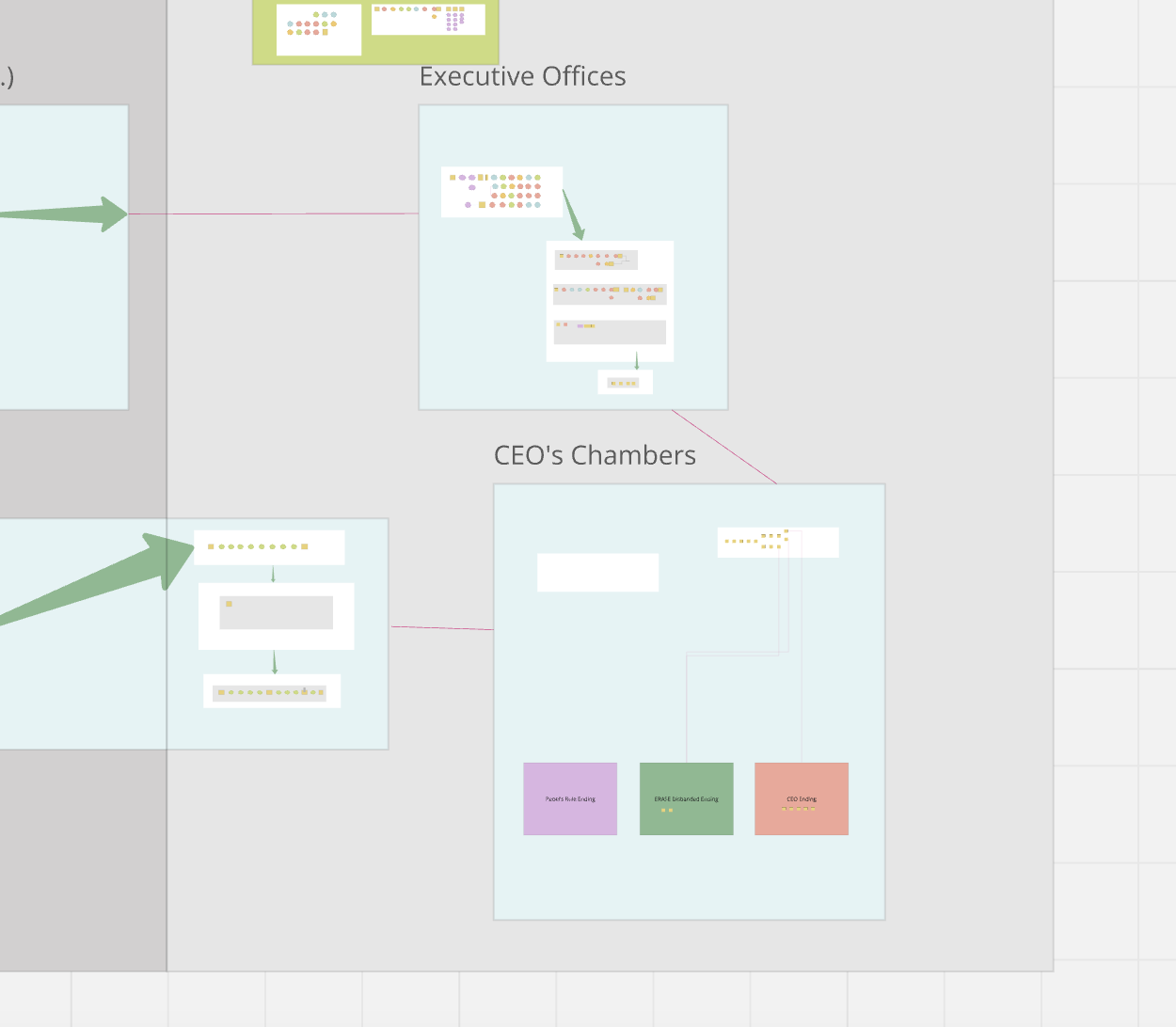 As you can see in the above image, two red lines connect to the blue box labeled "CEO's Chambers." That's the final area of our game. The red lines represent the two ways in which the player can reach the CEO's Chambers. But inside the blue box there is more branching. From the CEO's Chambers we can then use the "company health" metric (which I've mentioned in previous posts) to give the player the ending we want them to recieve.